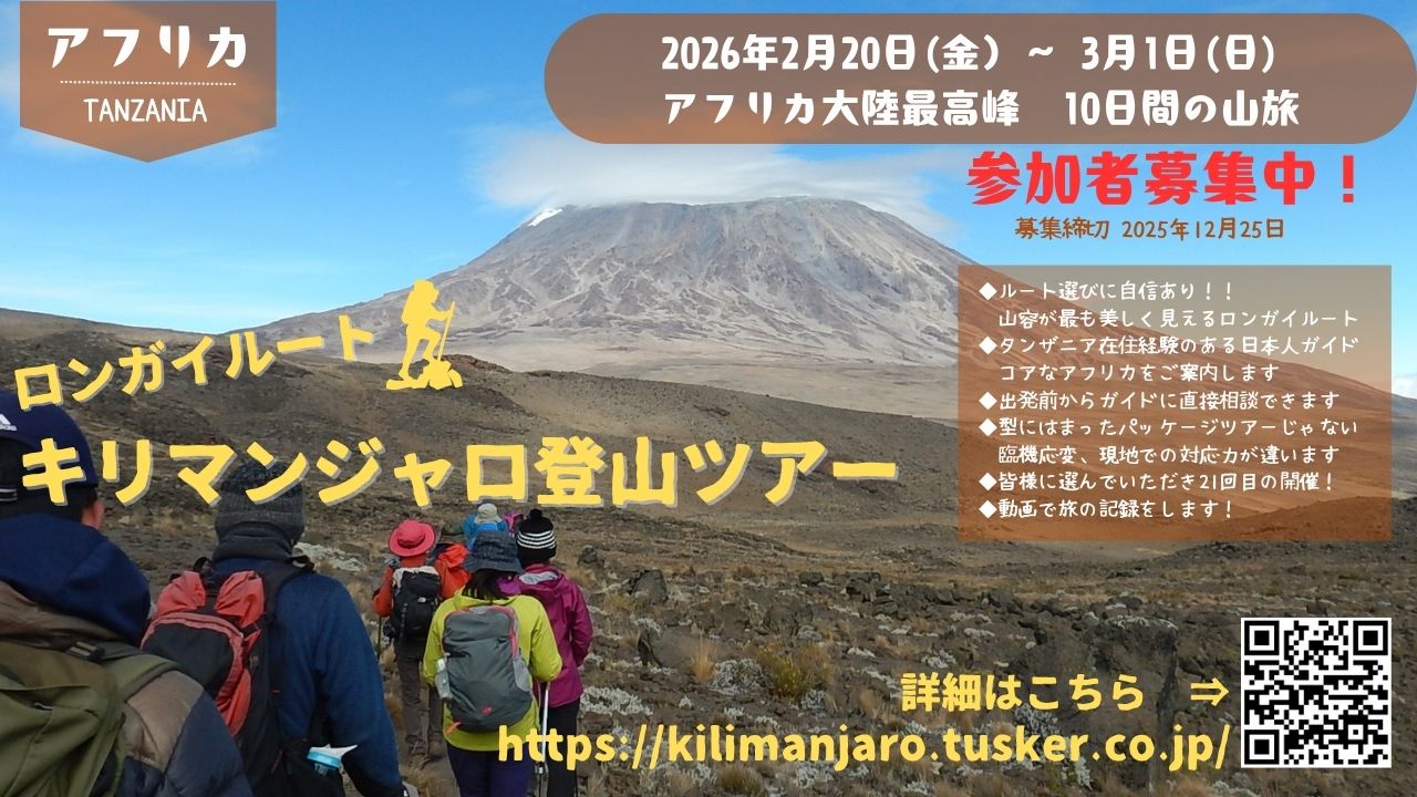 次回、キリマンジャロ登山ツアーの募集を開始しました。日程は、2026年2月20日~3月1日(10日間)です。すでに数名からお問い合わせをいただいております。ありがとうございます。詳細は募集ページをご確認ください。⇒ ht Read more about キリマンジャロ登山ツアーの募集を開始しました[…]
